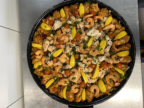 De paella wordt rijkelijk gevuld met de volgende producten: